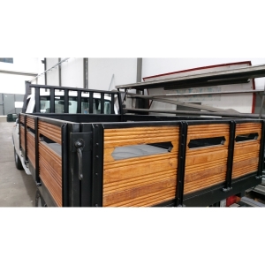 Carroçarias taipais de madeira envernizados, fundo madeira, chapa lisa ou xadrez, Cavalete em Rede + chapa, sub chassis em chapa, saias laterais.